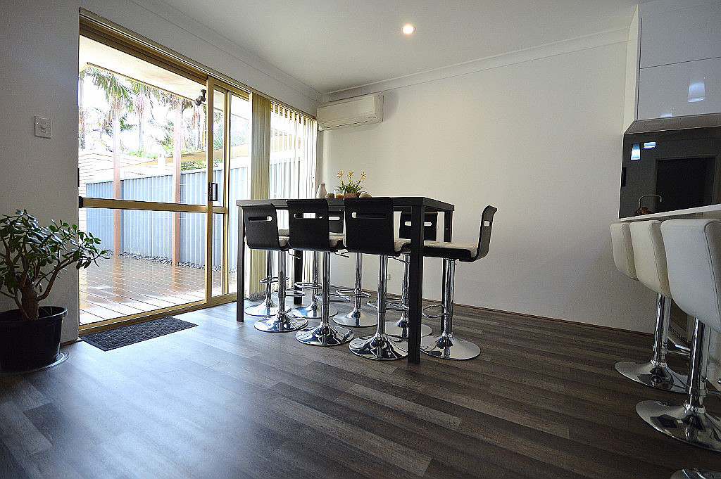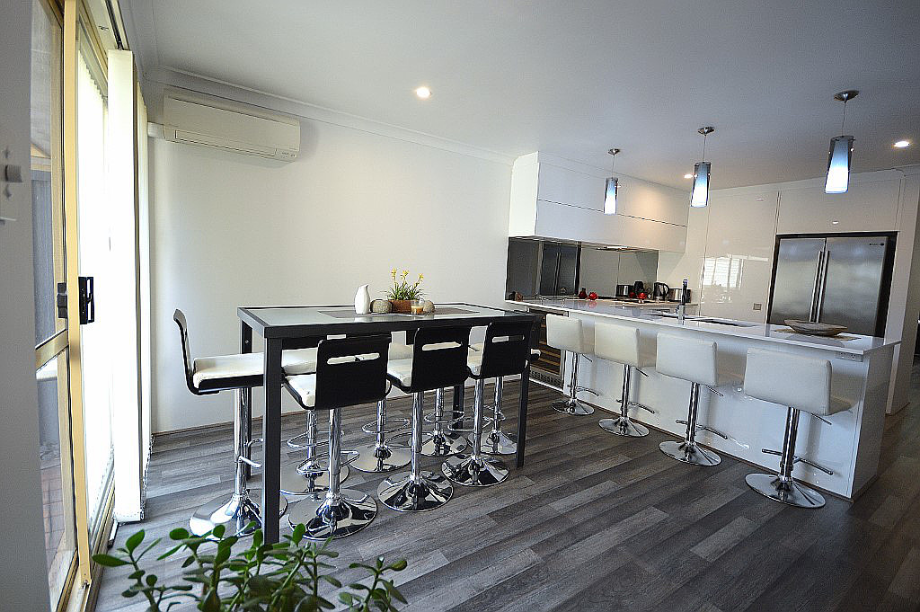 - Dining area includes an 8-seater high table and stools, split system on wall
