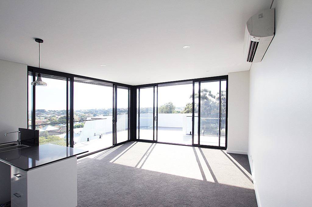- Large living area with floor to ceiling windows and modern blinds
